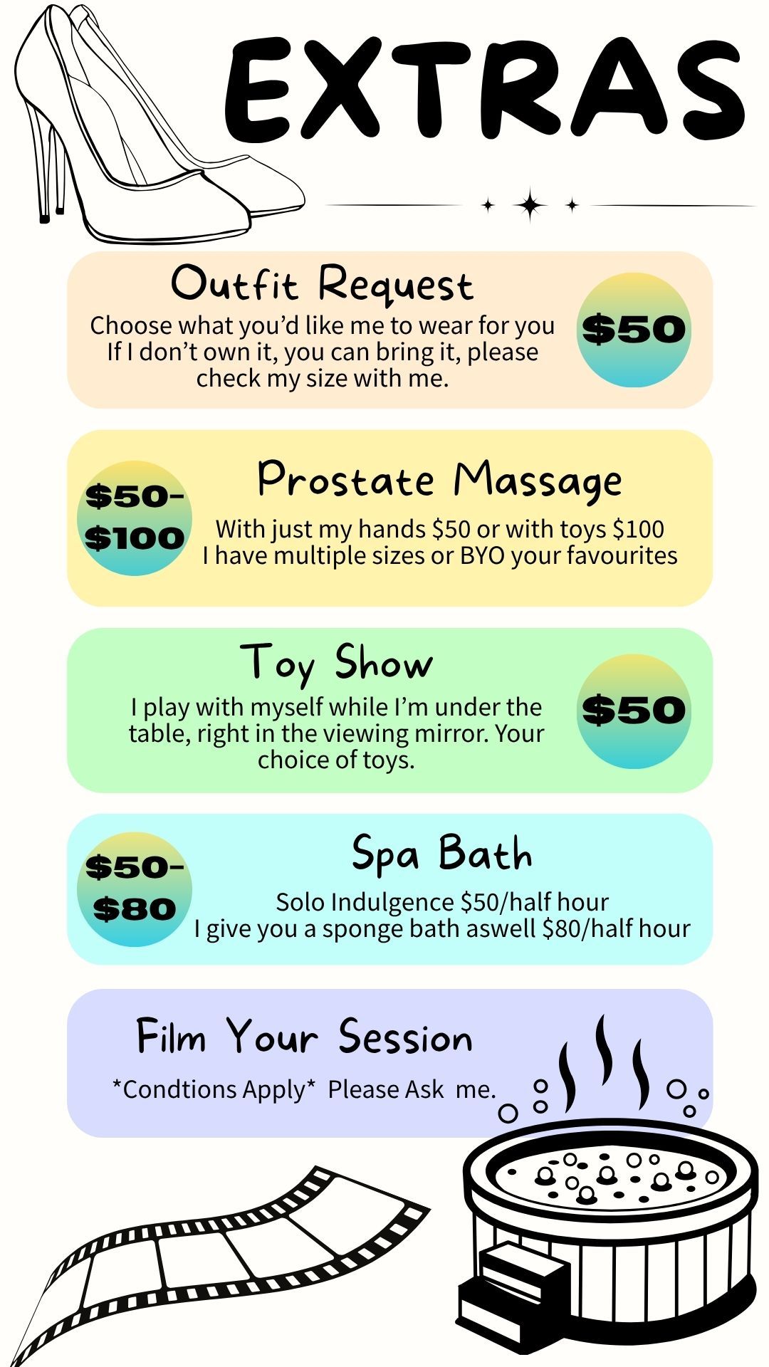 Deluxe service includes: My fanciest lingerie and heels, Toy show (your choice of toys) and prostate massage (optional)